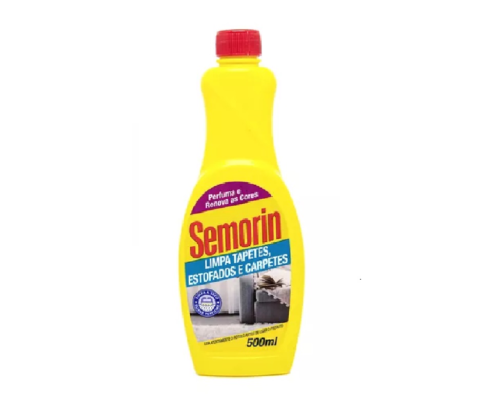 LIMPA TAPETES, ESTOFADOS E CARPETES 500ML A nova formulação do Limpa tapetes, carpetes e estofados Semorin remove a seco as sujeiras e gorduras mais difíceis, além das manchas criadas ao longo do tempo, sem necessidade de lavagem posterior. Com formulação baseada em produtos de uso profissional é extremamente prático e eficaz, deixando seus estofados, tapetes e carpetes perfumados, macios e dando vida nova às cores sem prejudicar os tecidos, aumentando assim a vida útil das peças. Pode ser utilizado também em estofados automotivos e outros tipos de tecidos (cortinas, persianas, mantas utilizadas por pets, etc). Com fácil aplicação e seguro para tecidos brancos e coloridos também ajuda a eliminar os odores impregnados de cigarro e mofo. CÓDIGO DO PRODUTO: REF.: REV.04 EAN: 7898917073131