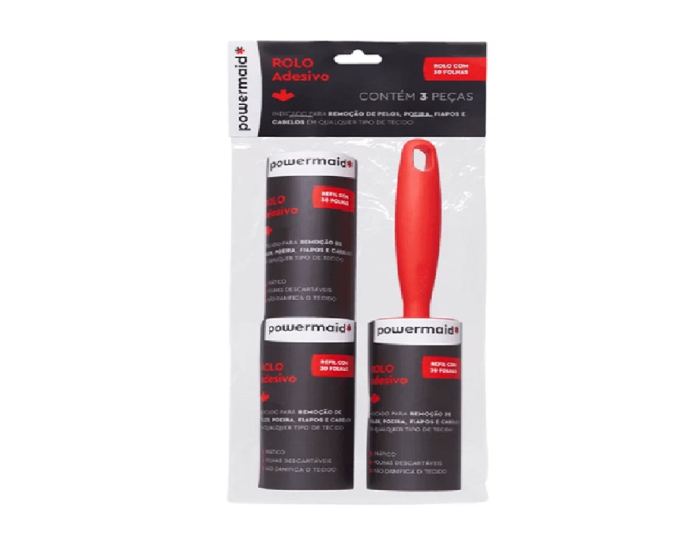 ROLO ADESIVO CONJUNTO 3 PEÇAS - POWERMAID Sabemos o quanto a limpeza eficiente e rápida é importante para você. É por isso que estamos empolgados em apresentar o Rolo Adesivo Powermaid, a solução que vai revolucionar a maneira como você lida com pelos de animais e sujeira em sua casa! Com sua tecnologia avançada de aderência, ele remove pelos, poeira e sujeira de todos os tipos de tecidos, deixando tudo limpo e impecável. Limpeza: Guarde o rolo sempre de pé ou pendurado de forma que o adesivo não encoste em nenhuma superfície. Sempre que necessário, limpe o cabo com pano úmido e seque imediatamente. Destaques: Ideal para remoção de pelos e fiapos Não danifica os tecidos Adequado para tecidos em geral Conteúdo: 1 Rolo adesivo 30 folhas 2 Refis de rolo adesivo CÓDIGO DO PRODUTO: REF.:RAP03 EAN: 7897753670085